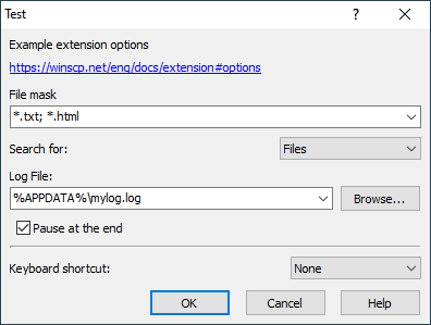 # @option - -config label "Example extension options" # @option - -config link https://winscp.net/eng/docs/extension#options # @option Mask -config textbox "&File mask" "*.txt; *.html" # @option SearchType -config dropdownlist "Search for:" -files ^ # -files="Files" -dirs="Directories" -both="Files and Directories" # @option LogFile -config file "&Log File:" "%APPDATA%\mylog.log" # @option Pause -config checkbox "&Pause at the end" -pause -pause