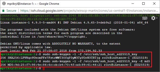 - To securely acquire a fingerprint of the host key, use web-based SSH client in Google Cloud Platform (use SSH link on the VM Instances page). In the console, use