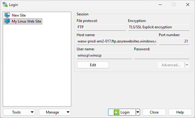 waws-prod-xxx-xxx.ftp.azurewebsites.windows.net. You can also paste a complete URL to select protocol, encryption and insert host name at once. - Enter the User name and the Password.