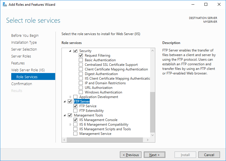 - Proceed to Web Server Role (IIS) > Role Services step and check FTP Server role service. Uncheck Web Server role service, if you do not need it.