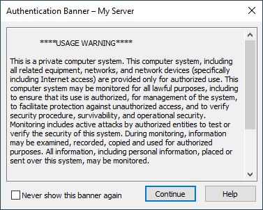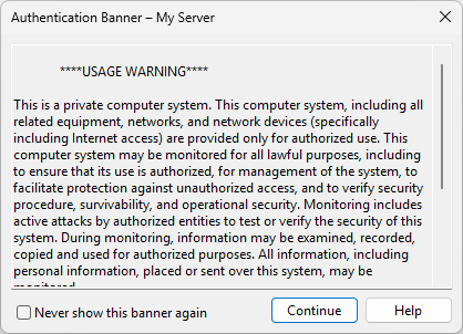 During authentication against SSH server, the server can issue authentication banner. It can contain various information, generally regarding security and server usage. After reviewing the text, press Continue button to continue.