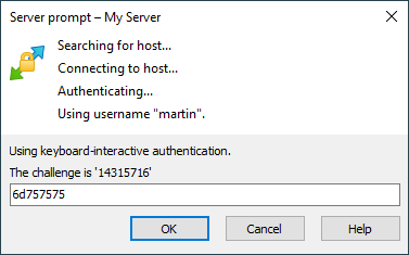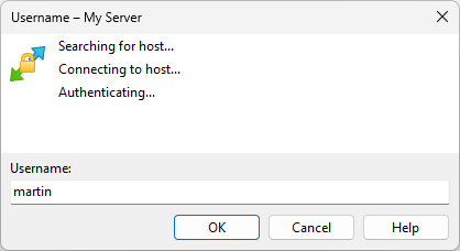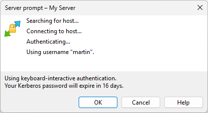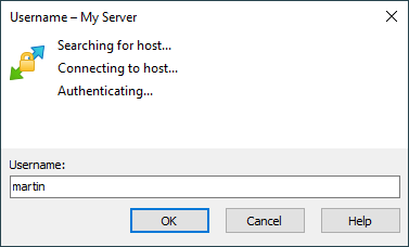During authentication WinSCP will present you with authentication window to show you progress of authentication and to prompt you to enter your credentials or other information.