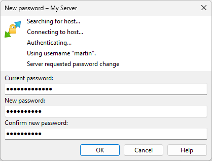 Note that the server may use keyboard interactive method for change password request. Then the prompts will differ.