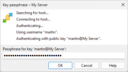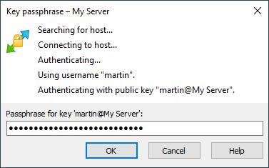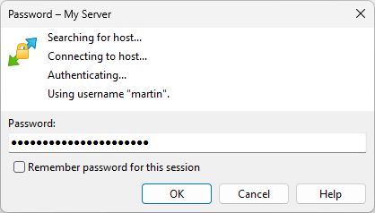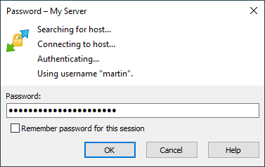 If you are using password authentication, you can enter your password directly on Login dialog. Otherwise, WinSCP will prompt you once a server asks for it. You will be prompted again if you enter invalid password. Also note that most of the servers will “prompt” for a password when you use invalid username, not to allow an attacker to learn if the particular account exists.