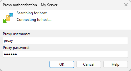 If WinSCP discovers that it needs a proxy username or password and you have not specified them in the configuration, it will prompt for the missing credentials.