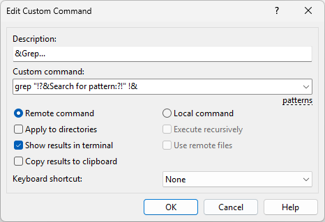 The Custom command box is where you type the actual custom command. The command typically includes patterns.