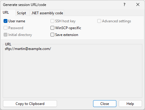 Check the User name to include username into the URL. The option is not available when the dialog is opened from the Login dialog and the user name was not specified; or (rarely) when the current session did not require the user name.