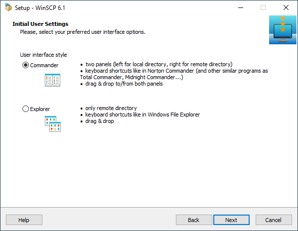 On the Initial User Settings page of the WinSCP Installer, you select the default user interface.