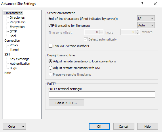 - Environment (server compatibility options, filename encoding, DST, etc)