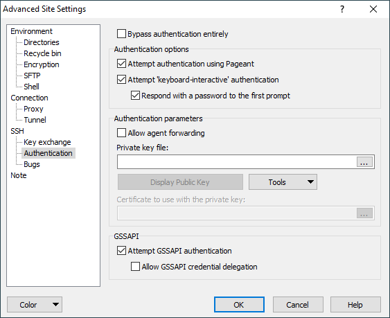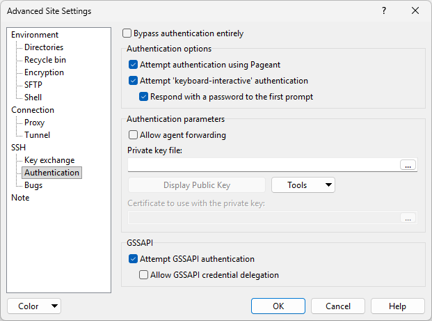 The Authentication page on the Advanced Site Settings dialog allows you to configure authentication options of SSH protocol.