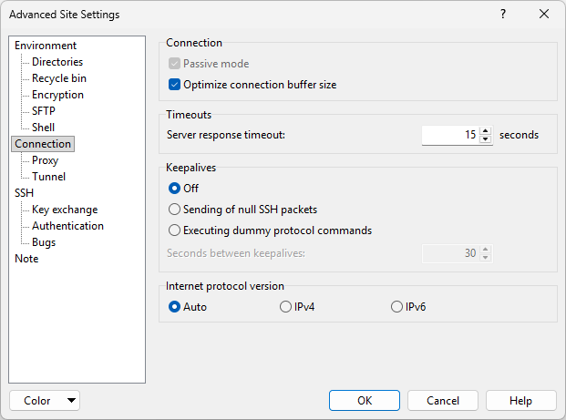 The Connection page on the Advanced Site Settings dialog allows you to configure general protocol-independent options for the connection.
