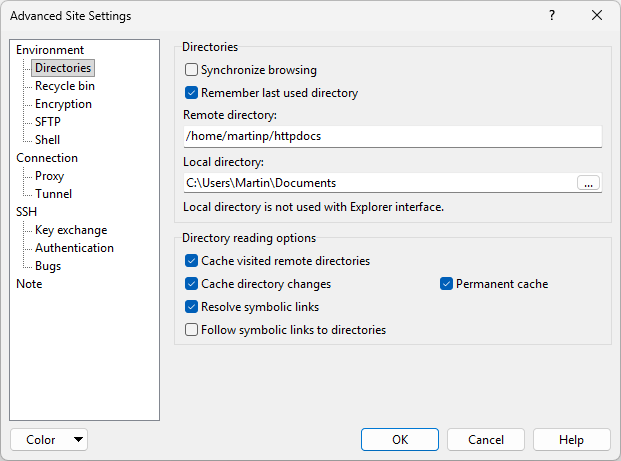 The Directories page on the Advanced Site Settings dialog allows user to configure initial session directories and the way how directory content is read.