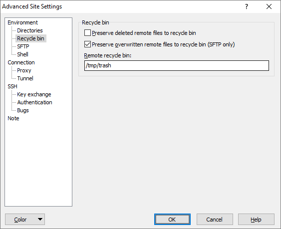 When Preserve overwritten remote files to recycle bin is checked, the remote file is moved to specified remote directory (recycle bin) before being overwritten by uploaded file. The option is supported only with SFTP protocol.