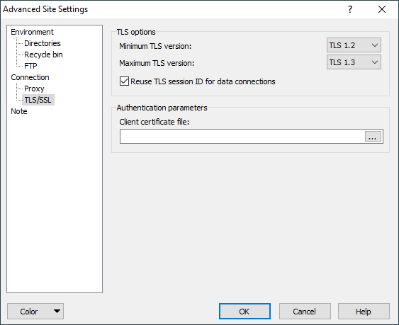 The TLS/SSL page on the Advanced Site Settings dialog allows you to configure options of TLS protocol for FTPS, WebDAVS and S3.