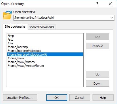 In Commander interface the Location Profiles dialog is additionally available. The Bookmark dialog manages either bookmarks that contain local directories or remote directories, depending on the context where the Bookmark dialog was opened. The Location Profiles dialog manages bookmarks that can contain a local and a remote directory at the same time.
