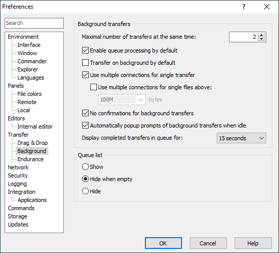 The Background page on the Preferences dialog allows you to configure behavior of WinSCP when transferring files in background.