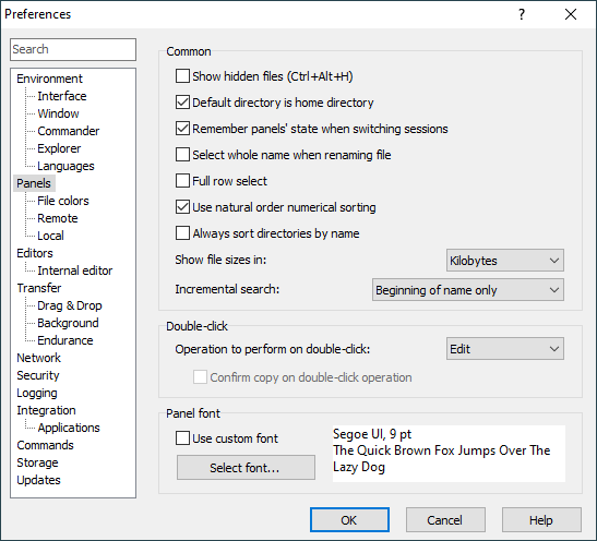 The Panels page on the Preferences dialog allows you to configure display and behavioral options of file panels.