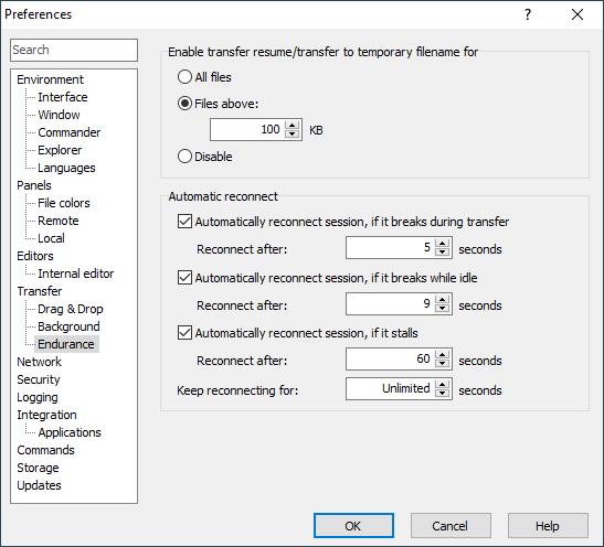 Use the Automatically reconnect session, if it breaks during transfer checkbox to enable reconnection of the session (and resuming transfer) when it breaks while transferring files. This is supported with SFTP and FTP protocols.