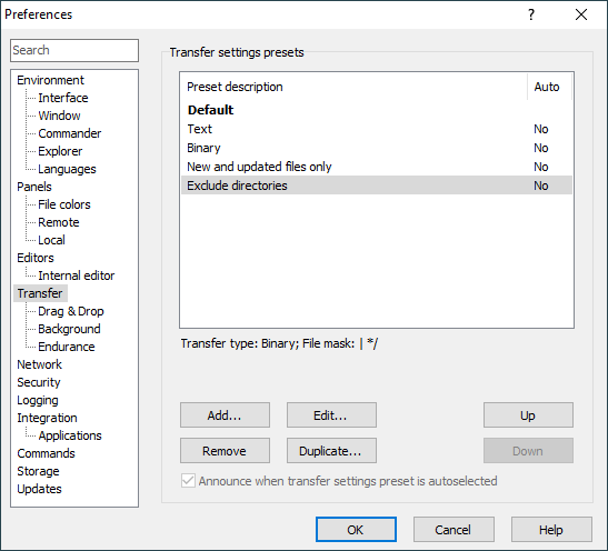 The Transfer page on the Preferences dialog allows you to configure default transfer settings and transfer settings presets (including autoselection rules).