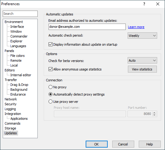 Use Allow anonymous usage statistics to control, if you allow WinSCP to collect non-personal usage statistics and send them to WinSCP team as part of the check for application updates. Before disabling this, please read, why it is important for us to know how you use WinSCP. Click View statistics to review statistics collected so far. The statistics are shown in an exact format as it is sent to us.