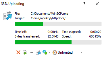 You will see the Progress window whenever WinSCP is performing some operation. Depending on the kind of the operation it will show various information about its progress.