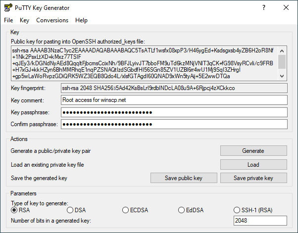 This file is in PuTTY’s native format (*.PPK); it is the one you will need to tell WinSCP to use for authentication.