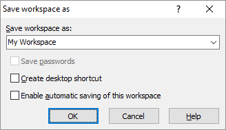 In Save Workspace dialog you specify a workspace name and options when saving workspace. You will get the dialog either after using Tabs > Save Workspace command in the menu or after choosing to save workspace when exiting the application.