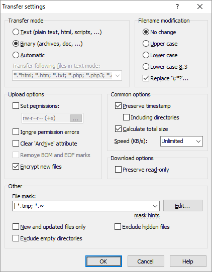 Use box Transfer mode to select preferred transfer mode. If you select Automatic mode, you should update the text file mask in Transfer following files in text mode. The option is not available with WebDAV and S3 protocols.