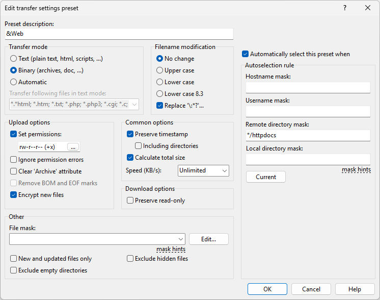 To allow WinSCP automatically select this preset (to override defaults) under particular circumstances, check Automatically select this preset when. This will enable the Autoselection rule box below.