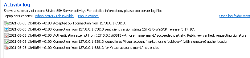 lvoSessionOptions = NEW WinSCP.SessionOptions(). lvoTransferOptions = NEW WinSCP.TransferOptions(). lvoRemoteFileInfoCollection = NEW WinSCP.RemoteFileInfoCollection(). lvoTransferOptions:TransferMode = TransferMode:BINARY. ASSIGN lvoSessionOptions:HostName = SFTP_Host lvoSessionOptions:UserName = lvcUsername lvoSessionOptions:Protocol = Protocol:Sftp lvoSessionOptions:PortNumber = SFTP_Port. /* If password is provided, uses standard user/pwd auth else uses PPK */ IF lvcPassword NE "" THEN lvoSessionOptions:Password = lvcPassword. /* The path to the clients local private pk file (ppk) - from which the public key is sent to the host */ IF SFTP_ClientPrivateKeyFile NE "" THEN lvoSessionOptions:SshPrivateKeyPath = SFTP_ClientPrivateKeyFile. /* the host SFTP server's "fingerprint" */ lvoSessionOptions:SshHostKeyFingerprint = SFTP_HostPublicKey. /* If the client's local Private/Public key pair is encrypted we'll need this */ IF SFTP_ClientPrivateKeyPassword NE "" THEN lvoSessionOptions:PrivateKeyPassphrase = SFTP_ClientPrivateKeyPassword. SFTPClient = NEW WinSCP.Session(). SFTPClient:Open(lvoSessionOptions).