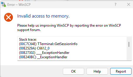 Zugriffsverletzung - ungültiger Zugriff auf den Speicher - TTerminal::GetSessionInfo