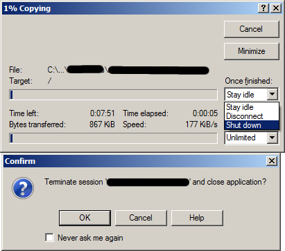 I just log in to notify you about an unexpected behaviour on WinSCP (congratulations about it. It is a great software). Yesterday I leave my computer alone while it was uploading some files. I selected "Shut down" on "Once finished" combo box and I went to sleep.