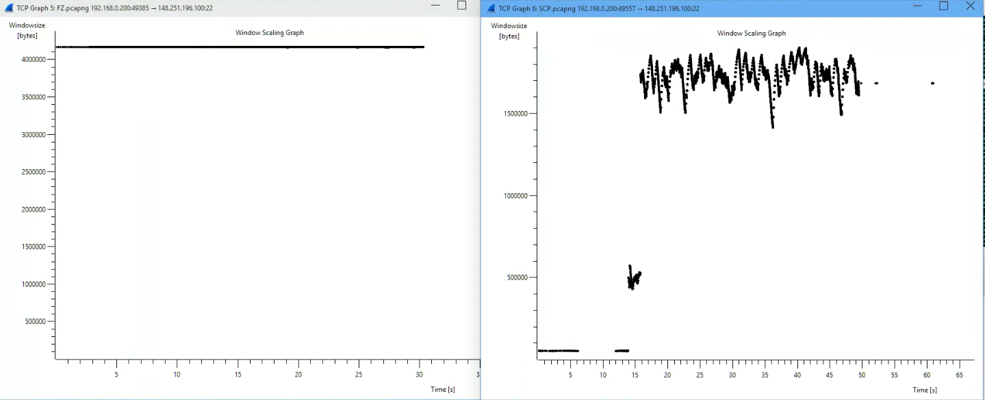 According to Wireshark's calculation Filezilla uses a fixed TCP window of 4194304 bytes from the very beginning, where WinSCP appears to use the more "standard" ramp up technique and hovers around 1700000 bytes once the download gets going. I'm unsure why it doesn't continue to increase. I didn't notice any significant CPU load during either download. I also tried alternating between AES and Blowfish encryption in the WinSCP options but this didn't make any difference (FileZilla uses AES by default).