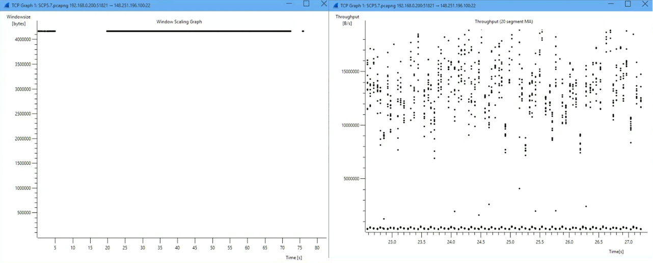 In contrast, WinSCP only takes 11 packets of 1460 bytes before a final 388 byte packet, totaling 16448. Time taken for each cycle varies significantly from 0.0015s up to 0.06s. The 16448 byte transmit window divided by the 5MBps throughput confirms an average cycle time of 0.003s. Again WinSCP is quite inconsistent with the ACKs sent per cycle, ranging from 1 every 2-3 packets received up to 7-8.