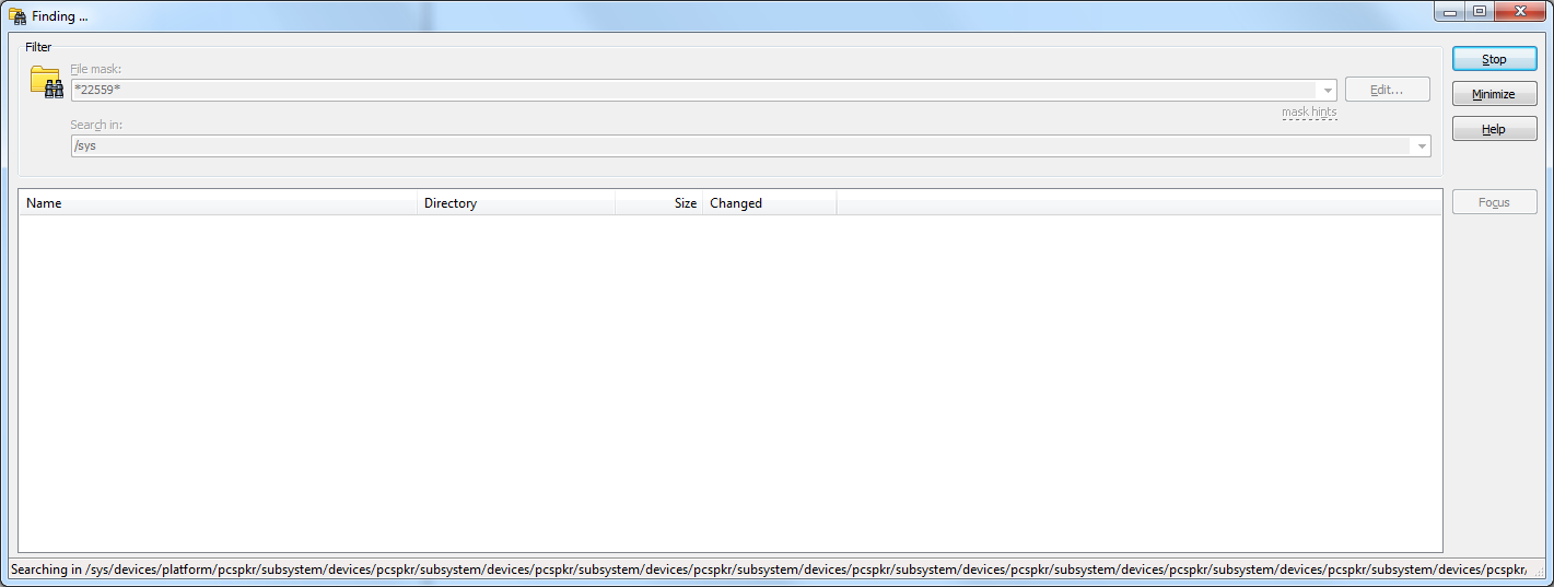 In particular, look at how the path on the bottom seems to be repeating. Looks to me like it has gotten stuck in an infinite loop that involves /sys/devices/platform/pcspkr/subsystem.