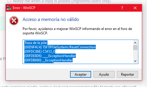 Also, note that when you click "OK" on the message below, the WinSCP window is frozen. You'll have to use task manager to end task.