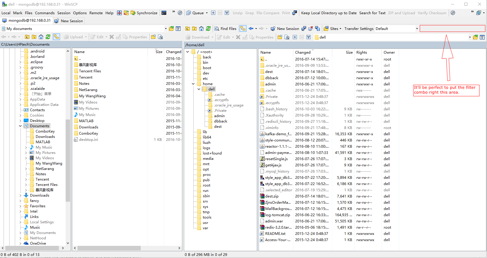 1. I suggest the filter feature for the remote/local file list is better to be an editor(commbo box) directly residing in the tool bar, rather than as a button and a dialog box. In this way, one can much directly input a filter, or even directly select a history filter in the dropdown.
