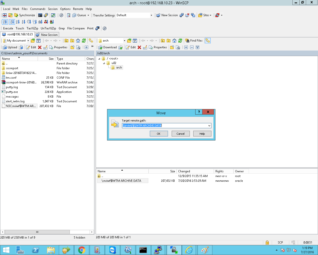I was trying to move offline oracle tablespaces from Linux VM server to a hard disk connected to the VM server using the 'Move to' option. I gave the Target remote path as well (please find attached).