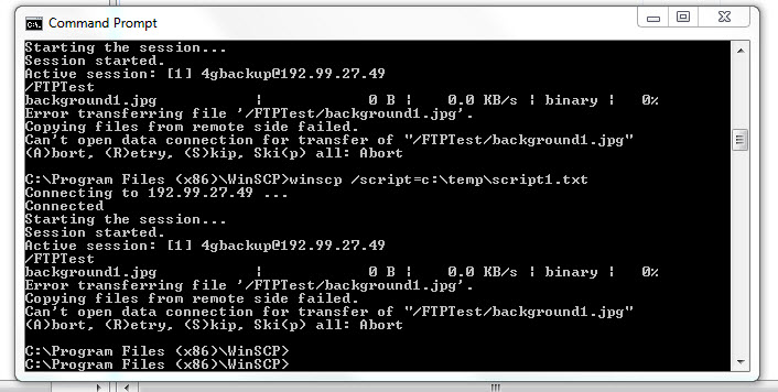 The script is supposed to connect to the ftp server (Filezilla FTP server) and then transfer the file background1.jpg to a local folder. When I run the script it seems to connect OK and then it shows the following error: