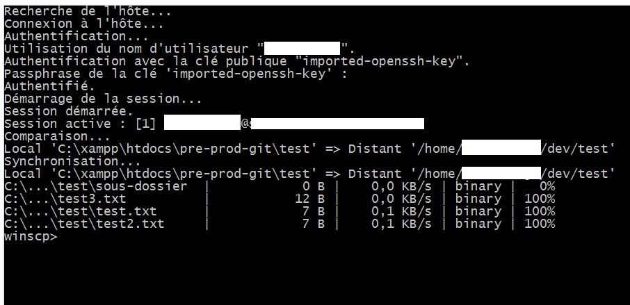 @echo off "C:\Program Files (x86)\WinSCP\WinSCP.com" ^ /log="C:\xampp\htdocs\WinSCP.log" /ini=nul ^ /command ^ "open sftp://xxx@xxx/ -privatekey=C:\Users\xxx\.ssh\id_rsa.ppk -hostkey=""ssh-rsa 2048 xxx""" ^ "synchronize remote C:\xampp\htdocs\pre-prod-git\test\ /home/xxx/dev/test/" "synchronize remote C:\xampp\htdocs\pre-prod-git\xxx\ /home/xxx/dev/xxx/" "put C:\xampp\htdocs\pre-prod-git\test.txt /home/xxx/dev/wxxx/" ^ "put C:\xampp\htdocs\pre-prod-git\test2.txt /home/xxx/dev/xxx/" ^ "exit" set WINSCP_RESULT=%ERRORLEVEL% if %WINSCP_RESULT% equ 0 ( echo Success ) else ( echo Error )