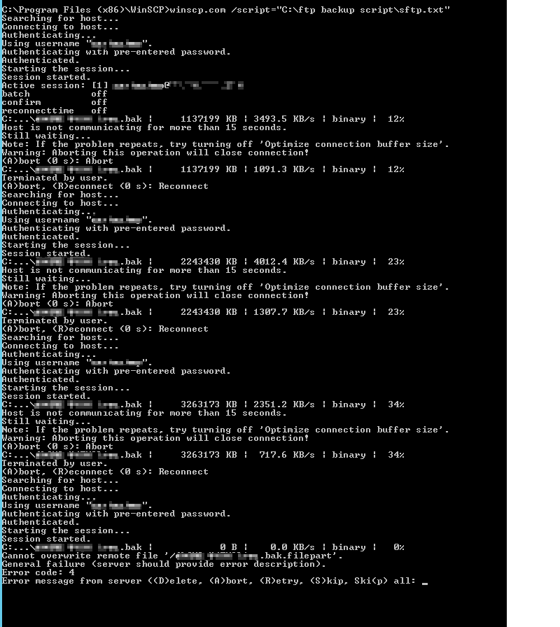 open sftp://USERNAME:PASSWORD@IPADDRESS/ -hostkey="KEY" -rawsettings SendBuf=0 QueueTransfersLimit=1 option batch off option confirm off option reconnecttime off put "C:\Program Files\Microsoft SQL Server\MSSQL12.MSSQLSERVER\MSSQL\Backup\DB1.bak" -resume -nopermissions -nopreservetime put "C:\Program Files\Microsoft SQL Server\MSSQL12.MSSQLSERVER\MSSQL\Backup\DB2.bak" -resume -nopermissions -nopreservetime exit
