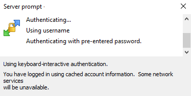 . 2019-06-06 15:00:34.078 Prompt (keyboard interactive, "SSH server authentication", "Using keyboard-interactive authentication.", "You have logged in using cached account information. Some network services