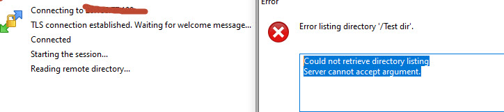 First time I connected using TLS / SSL it asked me to accept the certificate which I did, but it's just giving me an error of "Could not retrieve directory listing Server cannot accept argument".