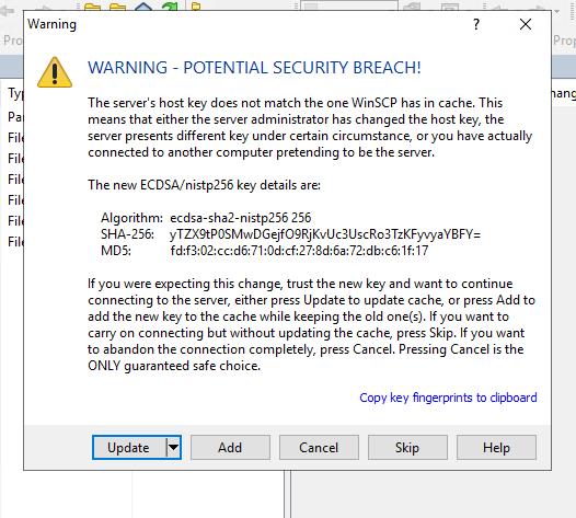 Is there A setting or something that I am missing. When I try to connect to my WingFTP server from another server that is using WINSCP it works for one day and then the next day I get this message. I not sure where to go from here. Below is a screen shot of the prompt that I am receiving in WINSCP.