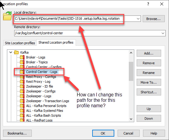 I can't seem to change the "Local Directory" path on an existing profile name in Commander View. When I go into "Open Directory/Bookmark" | "Shared Location Profiles" tab and select an existing profile name, I am not able to change the "Local Directory" path for that "profile name. The Local Directory no longers exists and I get an error "Directory .... doesn't exist" I have to recreate from scratch. Is there a way to change local directory path?