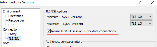 From the client I have no problem with the checkbox: "Reuse TSL/SSL session ID for data connections" under the "Advance Site Settings", I solve the problem.. but from code I can not find the corresponding action!