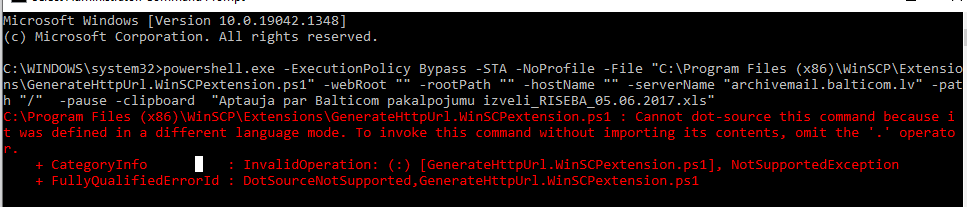 On SRP logs don't see anything was restricted.C:\Program Files (x86)\WinSCP\Extensions\GenerateHttpUrl.WinSCPextension.ps1 : Cannot dot-source this command because it was defined in a different language mode. To invoke this command without importing its contents, omit the '.' operator.
