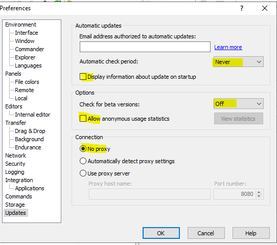 Update "Automatic check period" to Never | Turn off "check for beta versions" | enable "No proxy"