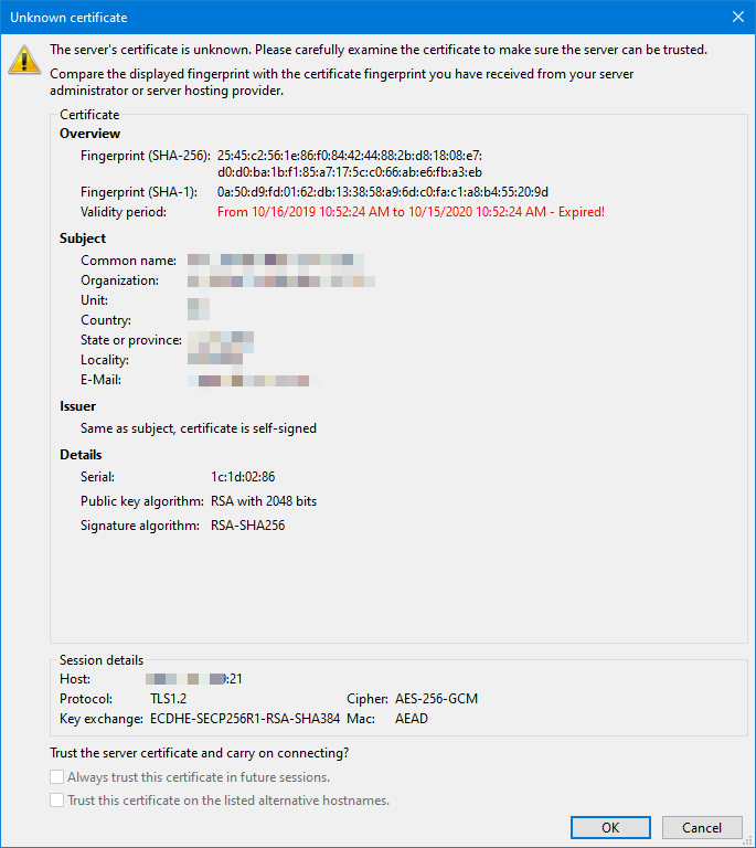 SessionOptions.GiveUpSecurityAndAcceptAnyTlsHostCertificate to work on the GUI interface. I've tried all sorts of combinations, but whenever I click save, the values I enter disappear / don't work.
