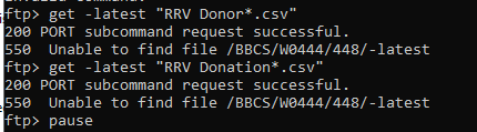 Relatively new to WinSCP. I'm trying to create a batch process to download 2 files from an outside vendor. I've used the GUI with Generate Code, copy/pasted that into my scripts but it does not run. No errors, the call to the script file does not appear to start. I've tried using different methods my other uses (get -neweronly "/BBCS/W0444/448/*.CSV") or another attempt using -latest in place of -neweronly, and it treats those as file names indicating it cannot locate the files. See attached.